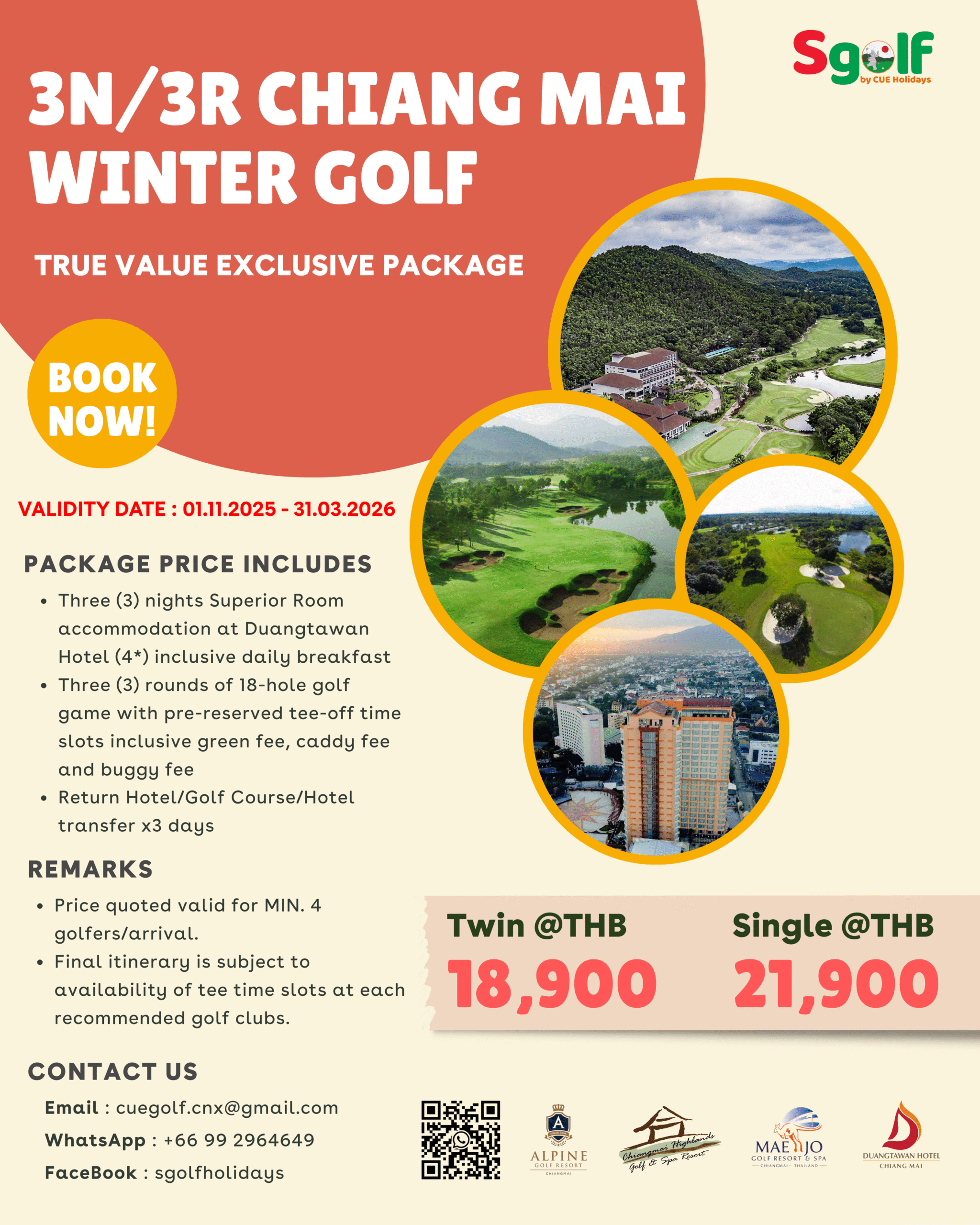 * Two incredible rounds of golf: Enjoy two pre-reserved 18-hole rounds at top courses in Chiang Mai. All green fees, caddie fees, and buggy fees are included.