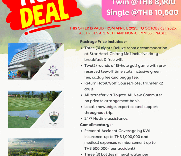 Your 3-Night Chiang Mai Golf GetawayThis all-inclusive package features: * Three nights of luxury accommodation: Relax...